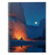 Mit diesem beeindruckenden Notizbuch finden Sie Einsamkeit und Verwunderung, wo ein einsamer Camper neben einem glühenden Feuer unter mächtigen Canyonwänden und einem Vollmondhimmel sitzt. Das warme Feuer gegen die coole Blues in der Nacht schafft einen Ort des Friedens, der Reflexion und des Abenteuers. Ideal für Träumer, Schriftsteller und Wanderer, ist es ein Notizbuch, in dem Ihre Gedanken wie Sternenlicht im Canyon widerhallen können.