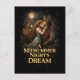 A magical moonlit forest scene where a young woman embraces a donkey-headed man as a mischievous fairy looks on, capturing the romance and whimsy of a midsummer night.