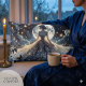 This enchanting visual art captures a serene fairy princess standing beneath a luminous full moon, surrounded by drifting golden fireflies and soft midnight clouds. Her flowing celestial gown cascades outward in intricate floral lace patterns, blending deep navy, silver-blue, and soft ivory tones into a dreamy, ethereal palette. The delicate glow of starlight and fluttering butterflies creates a whimsical, storybook atmosphere that feels both romantic and otherworldly. With its cottagecore-meets-fantasy aesthetic, this design evokes quiet magic, feminine strength, and moonlit wonder. The composition balances dramatic night sky contrast with soft, glowing highlights, giving it a boho fairytale elegance that feels timeless yet on-trend. Perfect for lovers of celestial art, dreamy fantasy, and graceful feminine silhouettes, this artwork invites you into a peaceful, star-kissed realm of imagination and light. AI generated artwork.