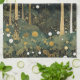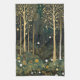 Eine fantastische und bezaubernde Waldszene mit einer tiefen grünen und goldenen Palette. Große, stilisierte Bäume mit goldenen Stämmen und Ästen reichen in Richtung eines dunklen Himmels, ihre Gliedmaßen mit leuchtenden, kugelförmigen Früchten oder Blüten verziert. Der Vordergrund ist ein dichtes, detailgetreues Tapeziermuster, das mit stilisierten Blume und Pflanze in Grün-, Creme- und Goldtönen gefüllt ist. Leuchtende Lichtorben schweben durch die Luft und die Erholung auf dem Boden und schaffen eine magische Atmosphäre, die an ein traumhaftes Waldland erinnert. Die Gesamtkomposition ist sehr dekorativ, mit einer flachen Perspektive und komplizierten Mustern, die die Leinwand füllen.