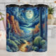Diese mystische Abbildung zeigt einen kurvenreichen Sandweg, der durch eine Wüstenlandschaft mit verschiedenen Kakteen und Wüstenlandschaften führt. Hochwertige Felsformationen erheben sich auf beiden Seiten unter einem dramatischen Nachthimmel mit Vollmond, hell inmitten von wirbelnden Wolken und zahlreichen Sternen.