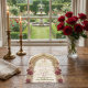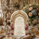 Celebrate your union with elegance featuring a traditional Islamic archway, deep burgundy roses, and the Bismillah in ornate calligraphy for a timeless Nikkah.This design features a sophisticated central layout dominated by a visually textured multifoil archway inspired by Moorish architecture, rendered in a faux carved beige stone effect. At the apex sits the Bismillah in formal Arabic calligraphy, framed by intricate geometric detailing. The structure is softened by clusters of vintage-style watercolor roses in deep burgundy and dark red, accented with muted brown and sage greenery. The typography hierarchy utilizes a classic serif font in dark charcoal against a warm cream background, creating a formal and legible aesthetic.