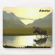 Irgendwo im Inneren von Alaska schleicht ein Elch an einem sonnigen Herbstnachmittag durch einen Teich. Mit dem Ende des Jahres nähert sich das Licht dem typischen gelblichen Ton, der alles ein wenig brüchig erscheinen lässt. Die Sonne fällt zwischen den Bergen im Hintergrund ab. Es erscheint auch das Textlesen "Alaska".
