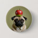 Der sonnige Mops mit einem Apfel, der auf seinem Kopf ausbalanciert.