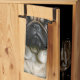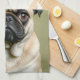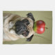 Der sonnige Mops mit einem Apfel, der auf seinem Kopf ausbalanciert.