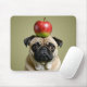 Der sonnige Mops mit einem Apfel, der auf seinem Kopf ausbalanciert.