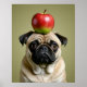 Der sonnige Mops mit einem Apfel, der auf seinem Kopf ausbalanciert.