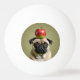 Der sonnige Mops mit einem Apfel, der auf seinem Kopf ausbalanciert.