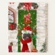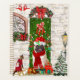 Mops Hunde Weihnachten sitzend draußen geschmückte Zuhause mit Weihnachtskranz, Weihnachtsbaum ist eine perfekte Weihnachtsgeschenk Idee für Hundefreunde.