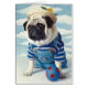 Ein hübscher Mops, gekleidet in seinen Jean-Decken und gestreiftes Shirt, das mit einem Strohsonnenblumenhut überzogen wurde. Lasst uns Ball spielen!