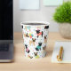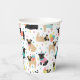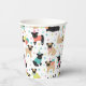 Cute birthday party Pug dogs with black and tan coats dressed in cute birthday outfits with ballons, cake and confetti pattern.