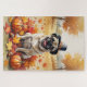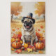 Ein Aquarellbild eines fröhlichen Hundes inmitten eines Haufen lebendiger Herbstlaub, umgeben von winzigen Kürbissen und verstreuten Eichhörnchen. Der Hund trägt einen kleinen Pilgerhut und strahlt vor Freude aus, um den Geist des Erntedanks zu erfassen. Im Hintergrund sorgen weiche Erntefelder und goldfarbene Bäume für eine friedliche Landschaft. Die sanfte Struktur und die warmen, gedämpften Herbsttöne verleihen der Szene ein gemütliches, nostalgisches Gefühl, das perfekt ist, um die Schönheit der Saison zu feiern.