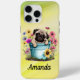 Ein Niedlich-gelbes Marmor iPhone 15 Pro Max mit einem Mops-Welpe in einem Pagel mit Blume, können Sie personalisieren