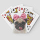 Mops Hund mit Zunge aus, mit einem rosa Band, weißem Hintergrund.