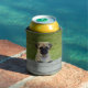 Adorable Porträtaufnahme eines Mops Welpen, der über einem Picknicktisch pinkelt.