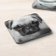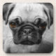 Schwarz-Weiß-Foto eines sehr niedlichen Mops Welpen mit großen, glänzenden braunen Augen und schwattigen, kleinen samtigen Ohren. Gutes Geschenk für sich selbst oder den Mops Liebhaber in Ihrem Leben.