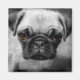 Schwarz-Weiß-Foto eines sehr niedlichen Mops Welpen mit großen, glänzenden braunen Augen und schwattigen, kleinen samtigen Ohren. Gutes Geschenk für sich selbst oder den Mops Liebhaber in Ihrem Leben.