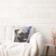 Rehbraunes Mopsgesicht über einer blauen hued Malerei mögen Hintergrundhundeliebhaber Throwkissen
