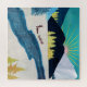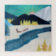 Eine digitale Landschaft mit hellen Farben und Texturen, die einen Musher mit einem Hundeschlittenteam zeigt, und einem leuchtend rosa Sonnenaufgang in den Farbtönen Blau, Gold, Cyan und Gelb.