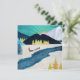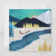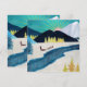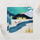Eine digitale Landschaft mit hellen Farben und Texturen, die einen Musher mit einem Hundeschlittenteam zeigt, und einem leuchtend rosa Sonnenaufgang in den Farbtönen Blau, Gold, Cyan und Gelb.