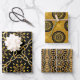 Set aus drei Packpapierblättern mit verschiedenen Mustern. Jedes Blatt weist ein nahtloses Muster aus geometrischen Formen in den Imitaten gold und schwarz auf.