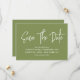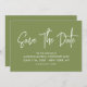 Moderne Kalligraphie Save the Date in moosgrüner Farbe mit einem digitalen QR-Code für eine Website oder Kontaktinformationen auf der Rückseite.