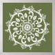 Dieses weiße Mandala sitzt auf einem dunklen Moos oder einem olivgrünen Hintergrund. Die Farben sind harmonisch und ausgewogen. Teil der Payon Mandala Kollektion.