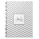 Le carnet en spirale personnalisé est doté d'un motif en chevron gris clair avec un nom personnalisé en police d'écriture noire et un monogramme en nuances grises assorties dans un cadre carré blanc.