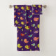 Serviette sertie d'un motif d'oiseaux lunaires dessinés à la main. De mignons petits pins verts les séparent. Arrière - plan violet foncé.
