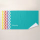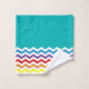 Serviettes de salle de bains personnalisées par motif turquoise à la mode de Chevron d'arc-en-ciel joli réglées. Amusement et arc-en-ciel brillamment coloré avec les rayures jaunes, oranges, rouges, pourpres, bleues et vertes de chevron sur un arrière - plan blanc et turquoise. Tween d'amusement, ado ou idées de cadeau d'enfants dans un thème d'arc-en-ciel. Personnalisé dans la police blanche sur la serviette de corps. Éditez pour changer le style de police. www.SamAnnDesigns.com