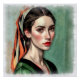 Diese aquarelle Inspiration zeigt ein künstlerisches Porträt einer Person mit romantischer Kunst. Man kann eine Frau mit einem farbigen Kopftuch (orange, weiß und schwarz) auf ihrem Kopf sehen. Sie trägt ein grünes Kleidungsstück mit schwarzen und roten Details. Sein Gesicht ist gekennzeichnet durch scharfe rote Lippen, Rosenwangen und einen scharfen Blick. Sie trägt auch einen Ohrring zu Schmuck. Der Hintergrund besteht hauptsächlich aus grünen Nuancen, die eine harmonische Atmosphäre mit den Klangtönen des Portrait schaffen. Künstlerischer Stil kombiniert klassische und zeitgenössische Elemente mit sichtbaren Pinselpillen und einer modernen Farbverarbeitung.