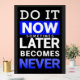 A bold motivational poster with Do It Now in white on black, highlighted NOW in blue, and the words Later and Never below. Encourages action, focus, and productivity in work or study spaces.