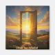 Eine strahlende Taste, die in lebhaften, goldenen Farbtönen leuchtet und eine Tür zu einem sonnigen Horizont mit üppig grünen Feldern und einem klaren Himmel öffnet.