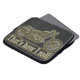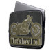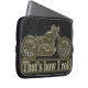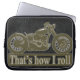 Um Ihren tragbaren Computer sicher und stilvoll behalten. Ein Motorrad mit den Worten "so rolle ich". Der Hintergrund ist eine gedruckte Imitation aus schwarzem Leder