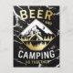 Eine grafische Abbildung auf schwarzem Marmorboden mit Berglandschaft, Zelt, Mond und Sternen in einem goldenen Rahmen mit dem Titel Biere and Camping Go Together.