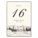 Die rustikalen, waldländischen Schick-Tischnummer-Karten bieten eine skizzierte Darstellung von Berggipfeln, Kiefern und einem fließenden Fluss, unter Ihrer Tischnummer, Veranstaltungsdatum und zusätzlichen benutzerdefinierten Text. Design wiederholt sich auf der Rückseite. Koordiniert mit unserer Trauersuite "Mountain Sketch".