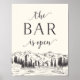 Mit unserem rustikalen Hochzeitsschild laden wir Sie ein, Ihre Lieblingsslibation zu genießen. Das 11x14 Bar-Schild weist eine untere Grenze von Berggipfeln, Kiefernbäumen und einen fließenden Fluss im handgezeichneten Stil auf, wobei "die Bar ist offen" in dunkelpflaumenbrauner Schrift steht.