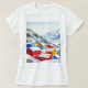 The image shows a watercolor painting of a colorful snowy mountain village.