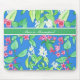 Ein hübsches Blumenmousepad mit einem cremefarbenen Mock Orange Blossom und hellrosa Weigela auf himmelblauem Hintergrund, von Judy Adamson handgemalt.