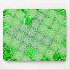 Em cores verde chamativas e t tons de verde normal, com quadrados e 'falha' falsa, proposital.