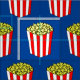 Coole Filmmaterial mit niedlichen Popcorn-Boxen mit gelbem Mais in einem rot-weiß gestreiften Paket. Hübscher blauer Hintergrund für eine Nacht mit den Sternen. Machen Sie coole Filmvorhänge oder Kleidung mit diesem lustigen Muster.