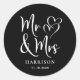Ein schicker schwarzer Aufkleber für Ihre Hochzeitskorrespondenz und Gastgeschenke mit "Mr. & Mrs." in einem großen weißen Drehbuch und einer weißen Abbildung von zwei Herzen vereint. Geben Sie Ihren Namen und Ihr Hochzeitstermin ein.