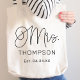 Modernes und lässiges schwarzes Kalligraphieskript "Mrs." Frauentote-Tasche bietet Sondertexte, die mit dem neuen verheirateten Nachnamen und dem festgelegten Hochzeitstermin personalisiert werden können. Perfektes Zubehör für die Flitterwochen und darüber hinaus!