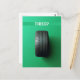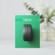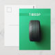 Eine grüne Postkarte mit einer Autoreifen-Illustration und dem individuellen lustigen Text "müde?". Dies ist eine lustige Postkarte mit einem Wortspiel-Spaß, den Sie Ihren Freunden vor dem Urlaub schicken können, um sie für einen Urlaub einzuladen.