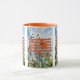 Cette tasse à deux tons présente un design qui comprend une police Saira Condensé avec des lettres vertes orange contour avec le verset "1 Jean 3:8" de la Bible KJV sur cette image avec une vue rapprochée d'un champ de fleurs avec des pétales blancs tiges vertes sous un ciel bleu clair nuageux en arrière - plan de ce thème basé sur la foi. Ce verset fait référence au Livre du 1er Jean 3e chapitre montrant le 8e verset de ce thème de citation de la Bible de la Bible du Roi Jacques. La jante et la poignée sont émaillées dans des couleurs assorties disponibles en 11 onces ou 15 onces de micro-ondes de taille et lave-vaisselle en céramique de construction sécuritaire.