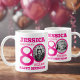 Joyeux 80e anniversaire texte rose, nom et deux photos. Amusant double face 80ème tasse photo personnalisée dans le design de texte rose en gras. Personnalisez cette tasse d'anniversaire avec une photo de la fille d'anniversaire au milieu du nombre 0 sur le devant et le dos. Idéal pour ajouter un peu de plaisir à un jalon de célébration du quatre-vingtième anniversaire et de garder comme un gardien spécial. D'autres options de couleurs et d'éléments correspondants sont disponibles. Design exclusif par Sarah Trett pour www.mylittleeden.com