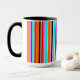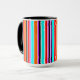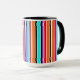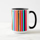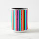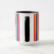 Cette tasse a un design simple de bandes verticales de différentes épaisseurs en rouge, orange, violet, noir, bleu clair et blanc.
