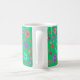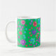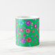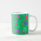 Une jolie tasse à café fleurie, avec un motif de fleurs vives en violet, turquoise, rose et orange sur un arrière - plan Jade Green, d'un collage de papier peint à la main par Judy Adamson. Vous pouvez facilement changer la couleur de l'arrière - plan, si vous le souhaitez, en utilisant le bouton Modifier.