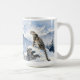 A pretty wildlife coffee mug with an illustration of a majestic snow leopard perched on a craggy, snow-covered peak, gazing out at a vast, frozen mountain range.