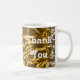Vous recherchez un cadeau d'appréciation qui présente un design abstrait élégant ? Ne cherchez pas plus loin que cette tasse "merci" avec un magnifique motif en or liquide et en argent qui ressemble à du métal liquide qui a plié et ridé pendant son refroidissement. Le design s'enroule autour de la tasse avec des mots d'appréciation présentés de chaque côté. Le "Merci" peut être customisé rapidement et facilement pour répondre à vos besoins.